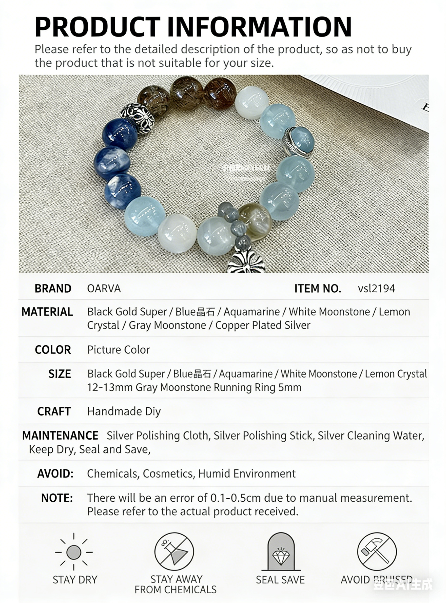 Women's Natural Aquamarine Bracelet, Unique Original Design, Moonstone & Black Gold Super Blue Crystal Jewelry