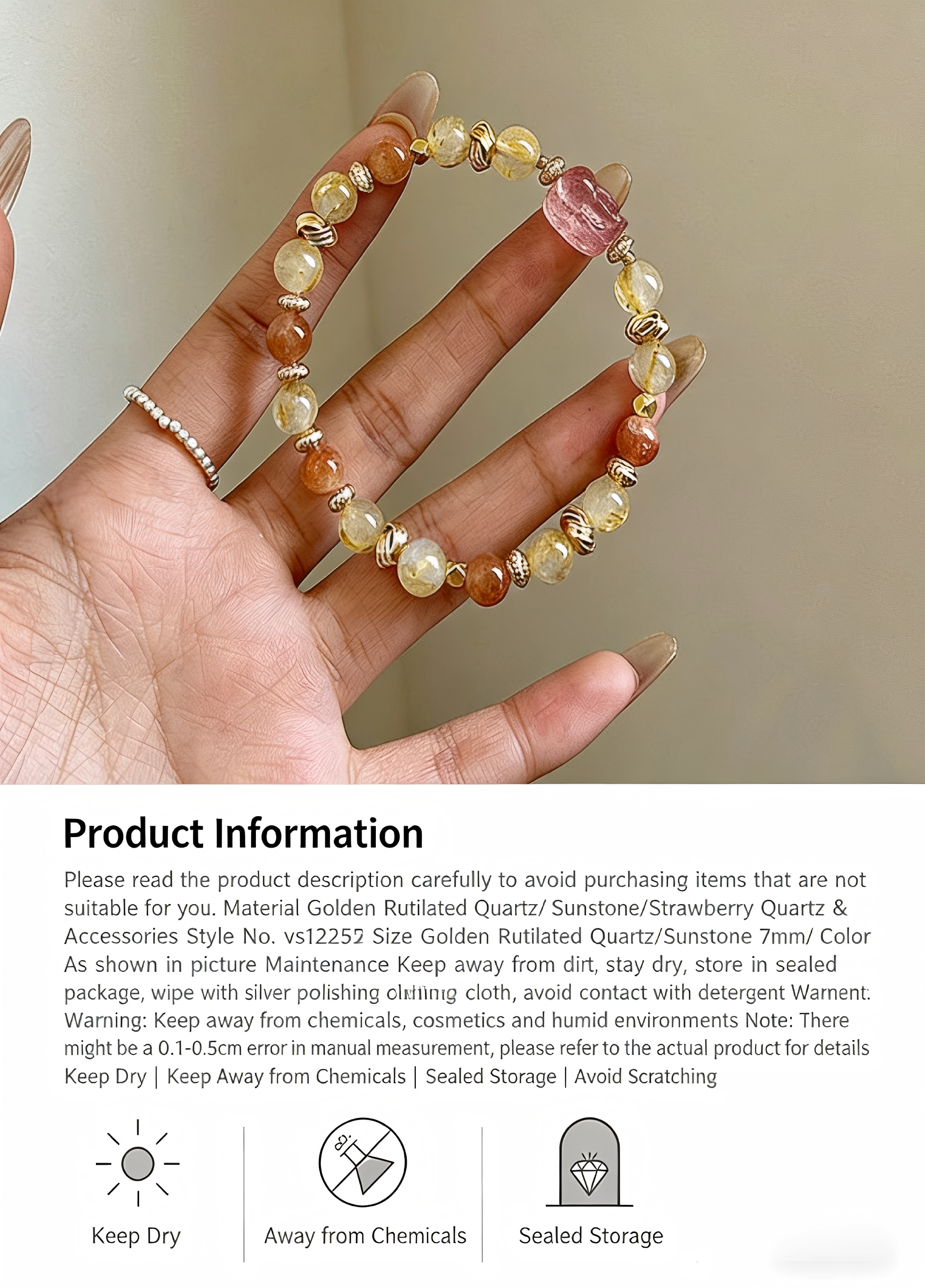 女性貔貅手鍊,搭配金色針狀水晶、草莓石英與橙色月光石,自然水晶財富幸運珠,送給她的禮物